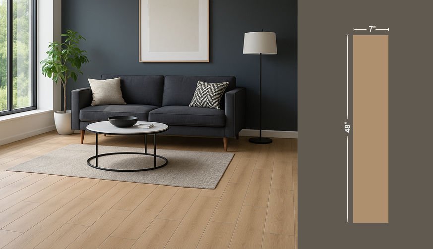 Dim: 121.92×17.78 cm. Thick: 0.65 cm. High-quality wall/floor covering: Laminproof Build Honey Oak.