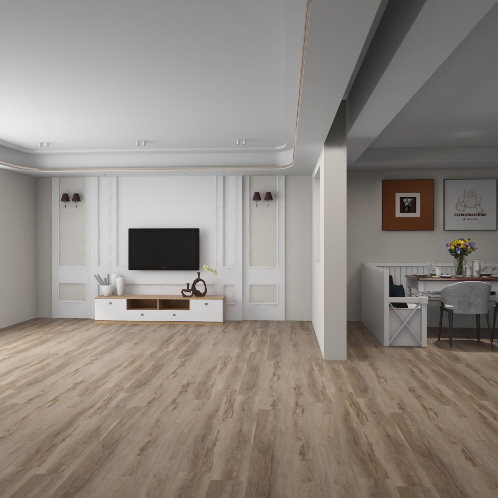 SPC vinyl flooring Quick48+ collection, Quick48+ Dark Greige model. Fast installation system. 100% waterproof. Modern design with wood texture.