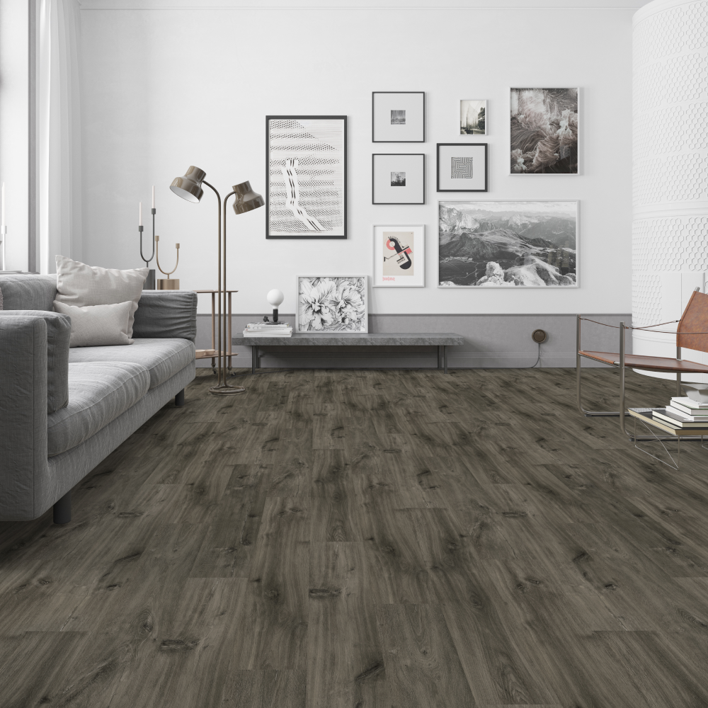 SPC vinyl flooring Quick48+ collection, Quick48+ Harmony Gray model. Fast installation system. 100% waterproof. Modern design with wood texture.